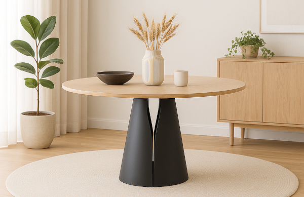 Tyylikäs ja näyttävä Cone-ruokapöytä on upea muotoilultaan ja sen ympärille on helppo sijoittaa neljä ruokatuolia. Pyöreä muoto mahdollistaa sen, että ruokapöytä on helppo sijoittaa monenlaisiin ruokailutiloihin. Ruokapöydän ruskea laadukas kansi on huonekalulevyä ja tammiviilua ja siinä on upea kalanruotokuviointi. Tukeva jalka on mustaksi pulverimaalattua metallia. Ruokapöydän halkaisija on 130 cm ja korkeus 75 cm. Kannen paksuus on 2,5 cm ja jalustan halkaisija 54,5 cm.